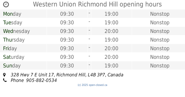 It is also possible to : Edit these OPENING HOURS of Branch Western Union In Richmond Hill, 328 Hwy 7 E Unit 17,
